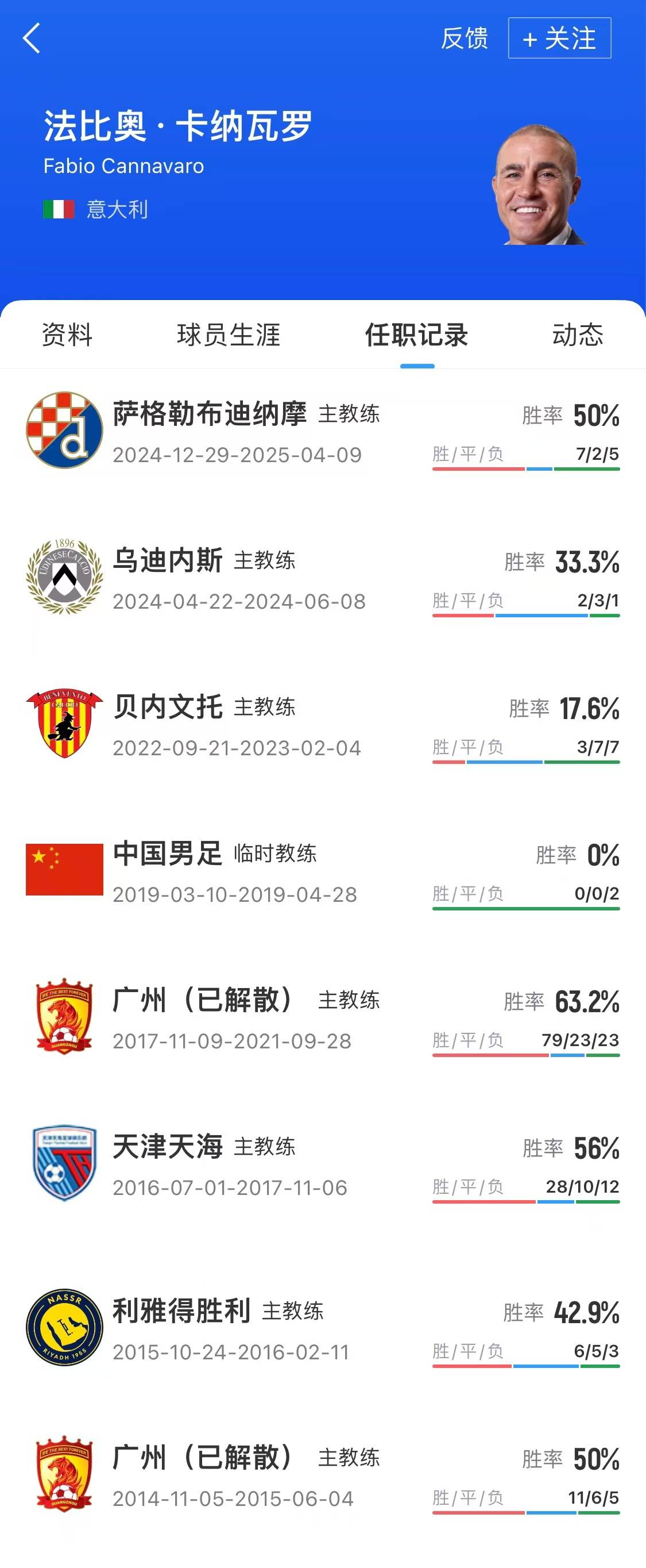 最新消息显示,前国足代理主教练法比奥·卡纳瓦罗已正式向中国足协递交应聘材料。这位51岁的意大利教头曾在中国足坛有过执教经历,先后带领广州恒大和天津权健取得过一定成绩。但值得注意的是,其2019年短暂代理国足主帅期间,带队两战皆墨,胜率尴尬地保持在0%。更令人担忧的是,卡纳瓦罗离开中国后的执教履历堪称滑铁卢——无论是执教沙特豪门利雅得胜利(胜率仅42.9%),还是意甲的贝内文托、乌迪内斯,乃至克罗地亚的萨格勒布迪纳摩,均以失败告终。