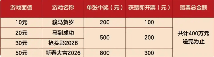 此外,2026年1月12日至2月19日,购彩者在山东省体彩销售实体店购买2026马年指定生肖主题彩票,无论是寓意美好的“骏马贺岁”“马到成功”,还是年味十足的“抢头彩2026”“新春大吉2026”,只要单张彩票中得指定金额,经销售终端“快速促销兑奖”模块扫描成功后,即可现场获赠对应价值的即开票奖励。