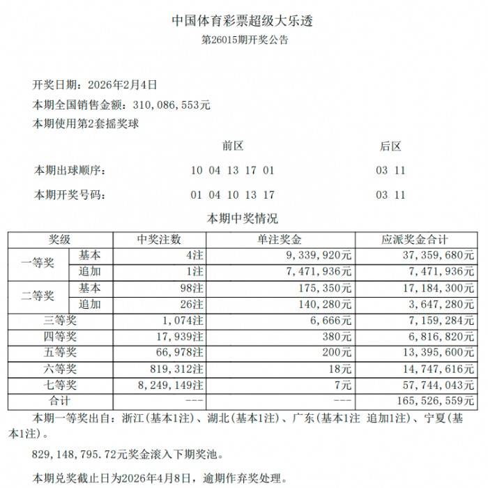 新规则第二期第26015期,中出4注一等奖,基本投注单注奖金达933万元,其中包括1注追加投注,追加投注奖金747万元;二等奖98注,基本投注单注奖金达到17万元,其中包括26注追加投注,追加投注奖金14万元。