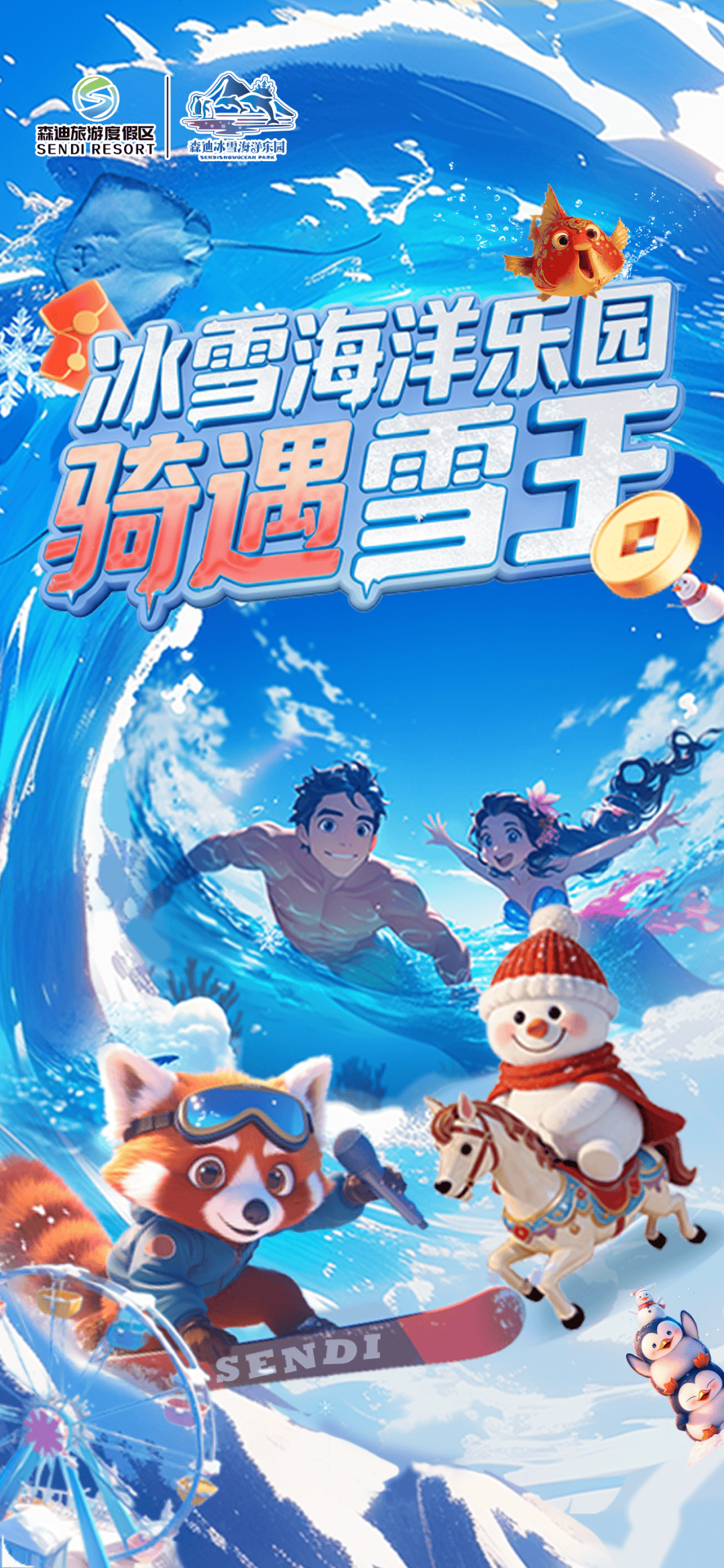 在-12℃的冰雪王国化身“雪域骑士”!与12米高的“雪王”冰雕合影,挑战极速雪滑道,看企鹅憨态可掬。极光飘雪时刻,马年专属许愿池点亮星空,浪漫值拉满!