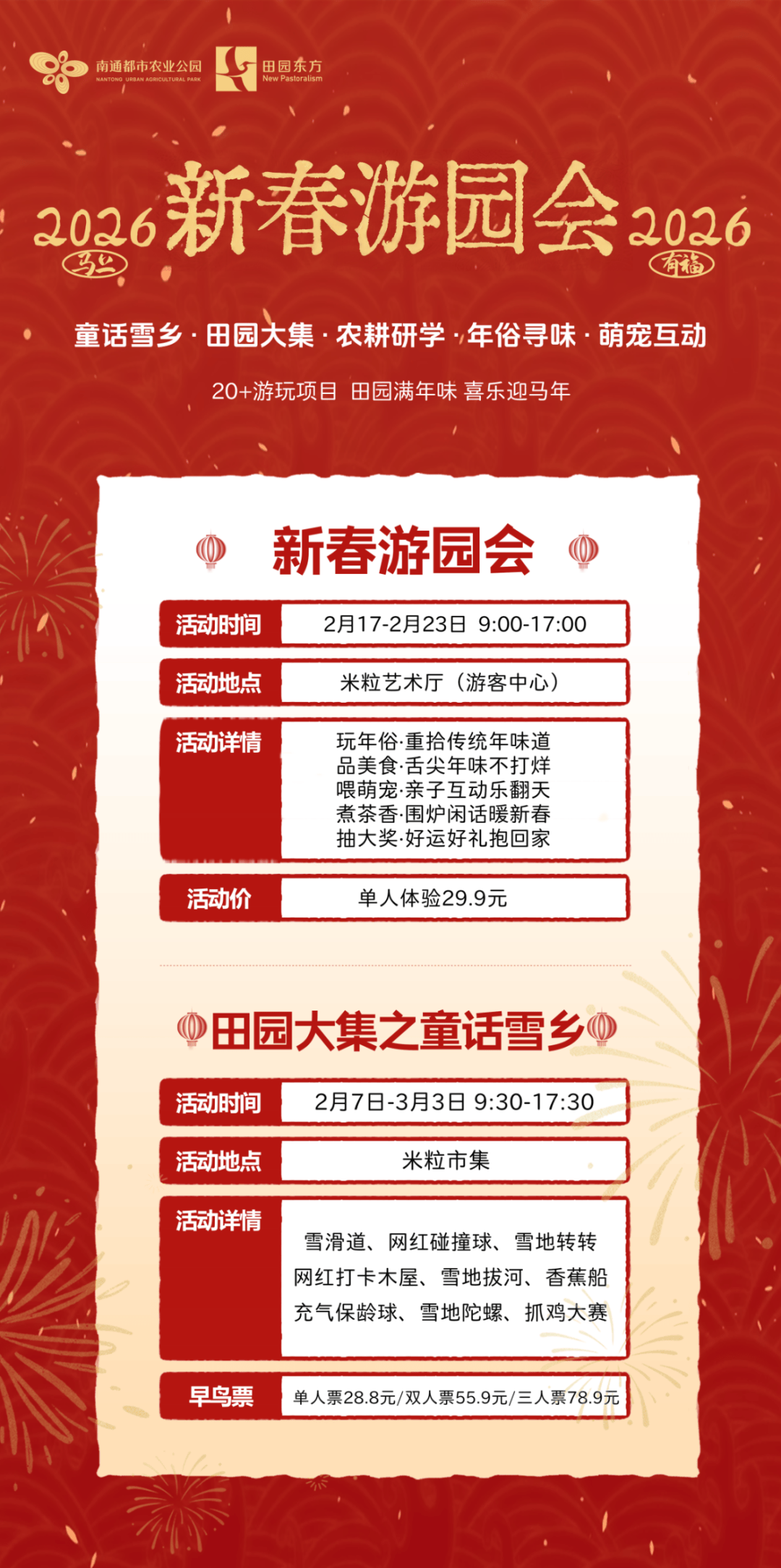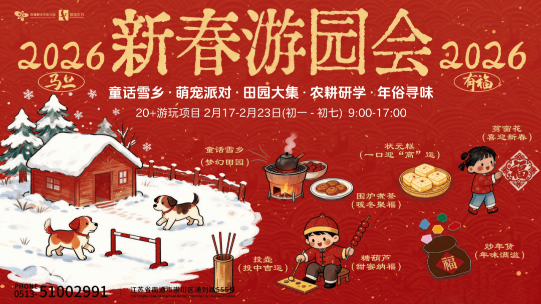 2月17日至2月23日,新春游园会单人票仅需29.9元。可免费享受15分钟钓鱼体验及蹴鞠、投壶趣味挑战各1次,搭配自制糖葫芦、年味美食9折优惠,萌宠互动、围炉煮茶与马年抽奖同步开启,100%中奖率搭配多重好礼。