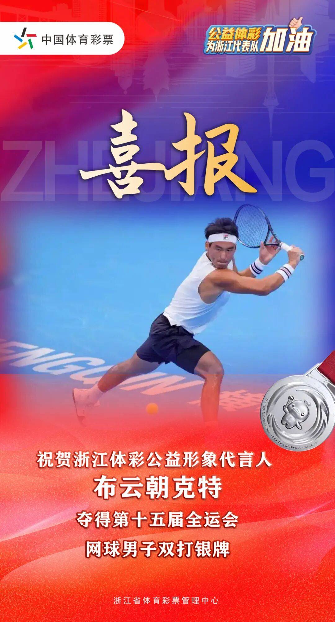 而在此前举行的十五运会网球男双项目中,浙江体彩公益形象代言人布云朝克特携手队友郑展获得亚军。布云朝克特表示:“我和搭档是今年第一次配双打,但从小一起训练十几年了,非常了解彼此。在全运会这么重大的舞台,我们已经做得非常好。”